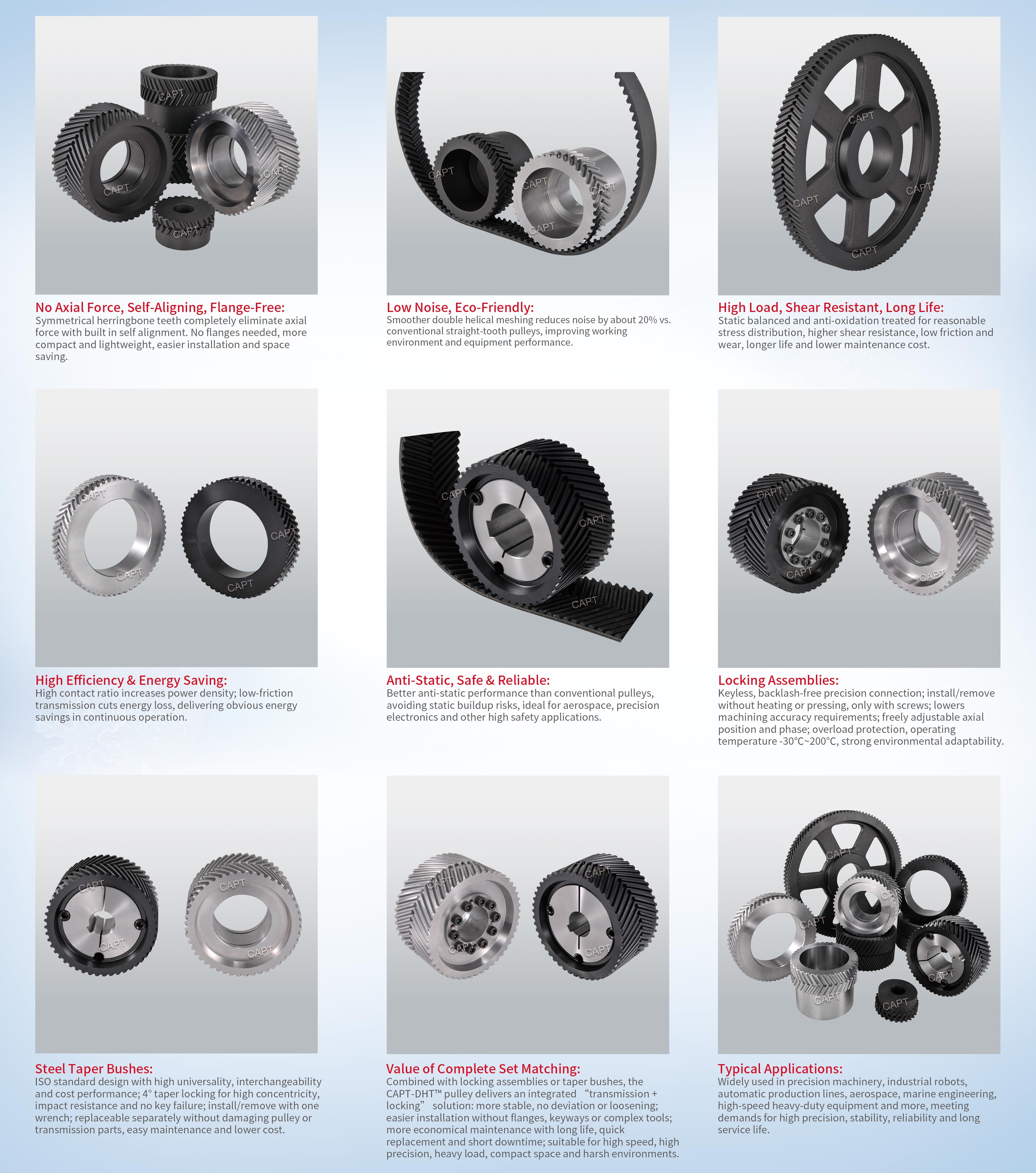The CAPT-DHT? Double Helical Herringbone Timing Pulley adopts two sets of helical teeth with opposite rotation directions arranged symmetrically to form a stable and reliable herringbone meshing structure that eliminates axial force at the source. Available in the full 8M–14M series, it can be matched with locking assemblies and steel taper bushes to form a complete transmission and locking system. It features high precision, low noise, stable transmission, energy efficiency, easy installation and long service life, making it an ideal component for high-end equipment transmission upgrades.